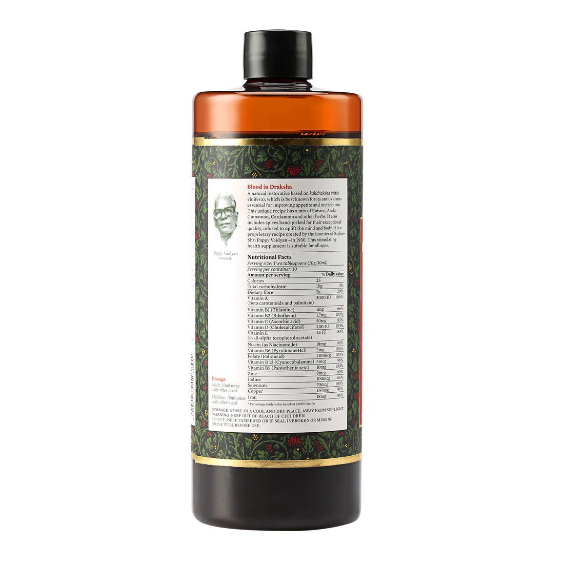Blood in Draksha is a proprietary recipe developed by the founder of Bipha – Shri Pappy Vaidyan that works as a restorative. This rejuvenating, haematinic and digestive supplement is suitable for physically active people, athletes, growing children, pregnant, elderly, and convalescents. It is a unique formulation containing essential micro minerals and vitamins. A comprehensive blend of Kali Draksha (Vitis vinifera), Lohabhasma (Ash of Iron), Mandurabhasma (Iron oxide), Dates (Phoenix dactylifera), myrobalans, and exotic spices that are rich in polyphenols, antioxidants, and other bioconstituents, this delivers requisite nutrients that help in bridging the nutritional gap. The dosage of Blood in Draksha varies for adults & children. Adults should consume 30 ml daily & children should take 15 ml. Consume the tonic only after food & preferably once in the morning.