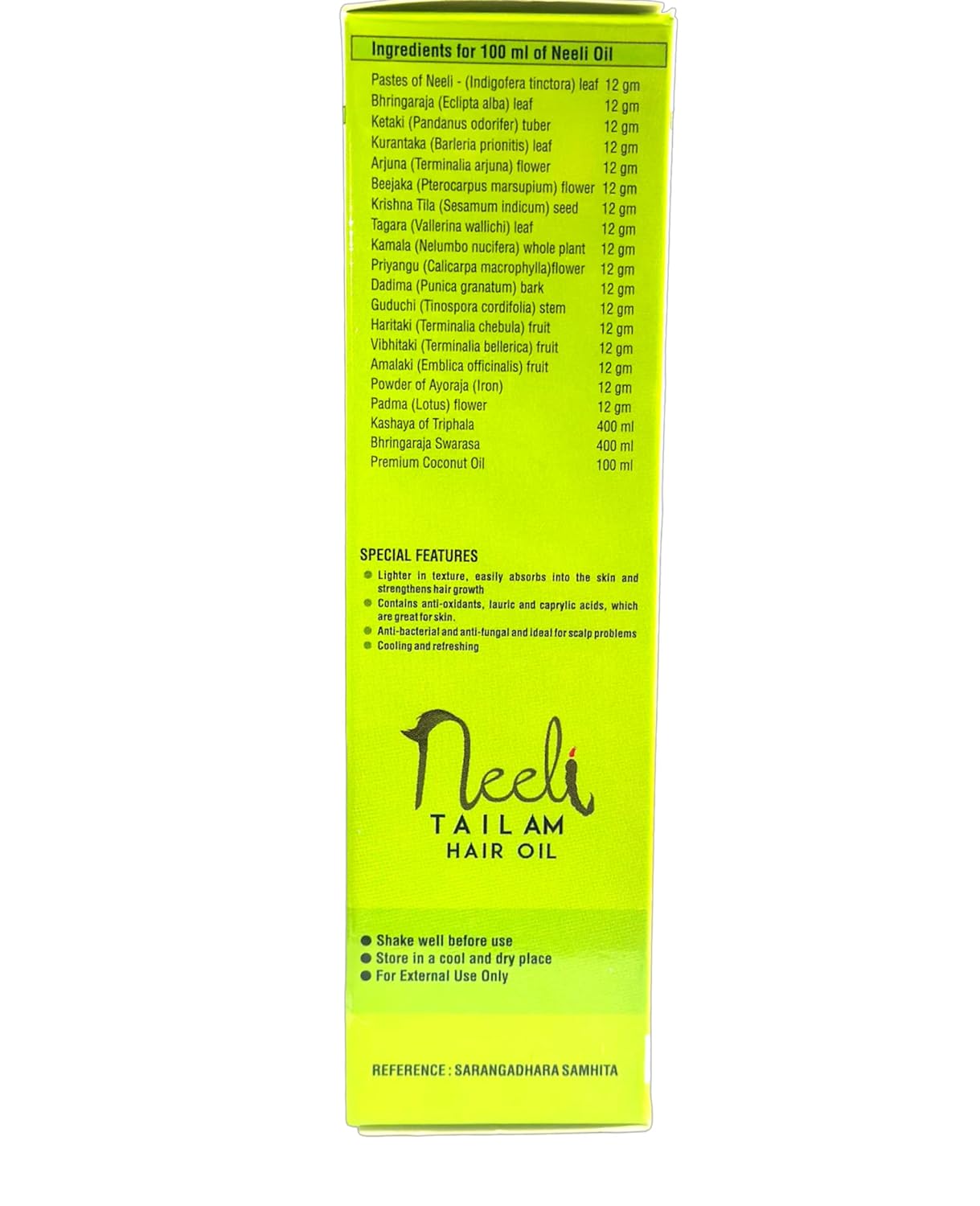 Dxn Neeli Tailam Hair Oil 100ml is specially formulated with the richness of indigofera tinctora, eclipta alba, pterocarpus marsupium, sesamum indicum, terminalia chebula, terminalia bellerica, emblica officinalis, lotus flower and premium coconut oil as its main ingredients