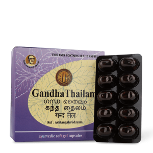 Gandha Thailam is an Ayurvedic oil fortified with potent herbs that can be taken internally. Compared to the traditional oil format, this soft gel capsule form is more palatable and easy to consume orally. This wholesome formulation helps in overall bone and joint health. When consumed appropriately, the formulation aids faster healing of fractures and is beneficial in aiding recovery from sprains .