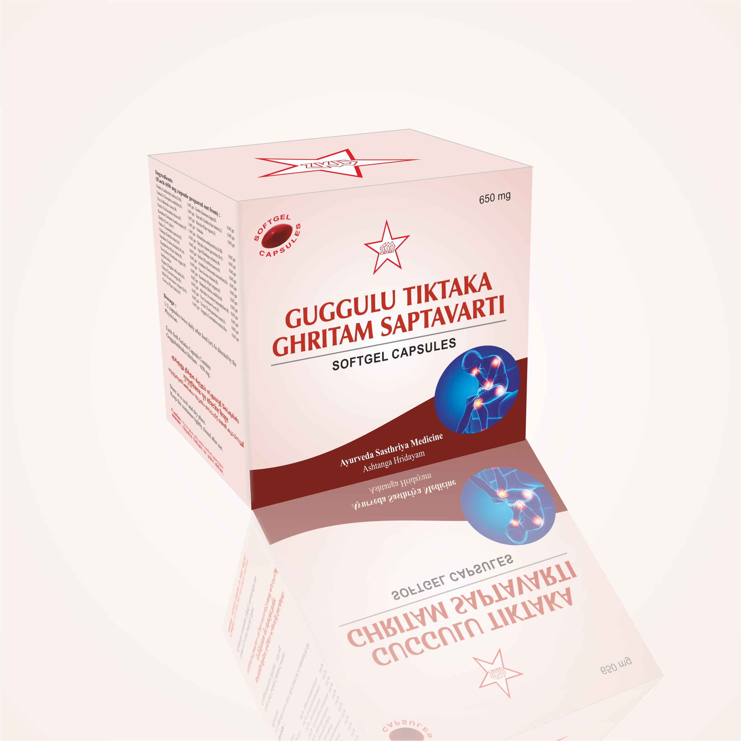 Gulguluthikthaka Ghritham softgel capsule is a medicated ghee effective in Vata disorders and various types of skin diseases. The herbal ingredients processed in Cow's ghee helps reduce rheumatic conditions, inflammatory conditions and digestive system disorders. It promotes healing of chronic non-healing ulcers, fistula and skin issues.