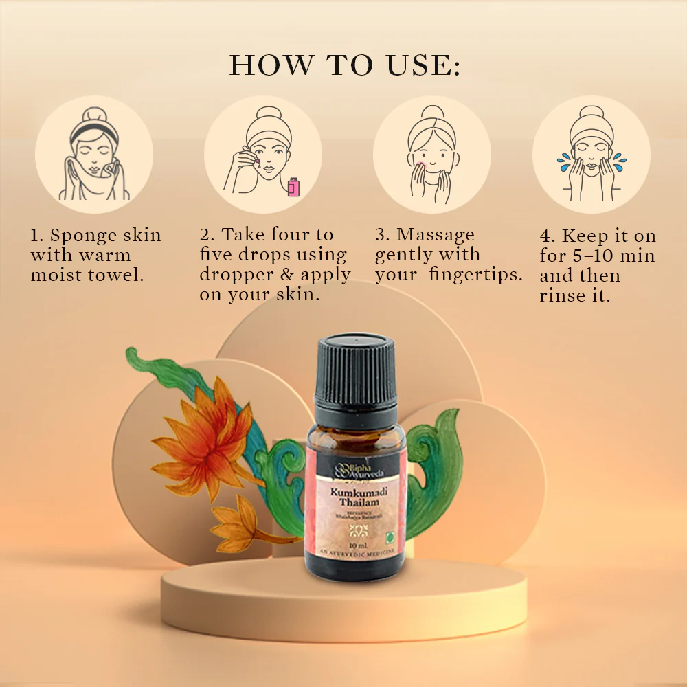 Kumkumadi Thailam blends the purest Kashmiri Kesar (Hindi for saffron) and several other botanicals like Marayoor sandalwood, Indian Madder, and Indian liquorice to create one of Ayurveda’s most exclusive beauty secrets. When massaged daily as part of your night-time beauty ritual the age-protection and blemish-correction properties of this authentic Ayurveda oil can work wonders on your skin.