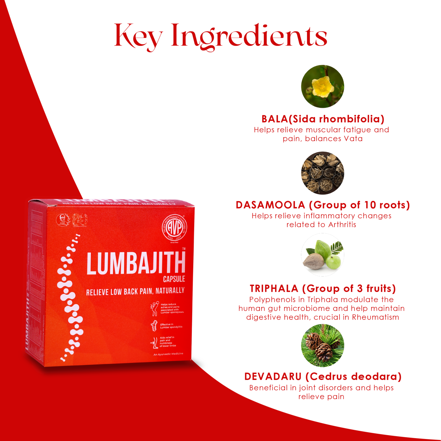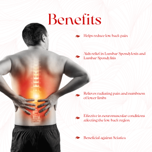 An Ayurvedic proprietary formula providing support in Low back ache! A versatile composition, Lumbajith Capsule from AVP (Coimbatore) Ltd is curated to aid relief from different types of Neuro-muscular and degenerative conditions affecting the lumbar vertebrae. Helps reduce low back pain Aids relief in Lumbar Spondylosis and Lumbar Spondylitis Relieves radiating pain and numbness of lower limbs Effective in neuromuscular conditions affecting the low back region