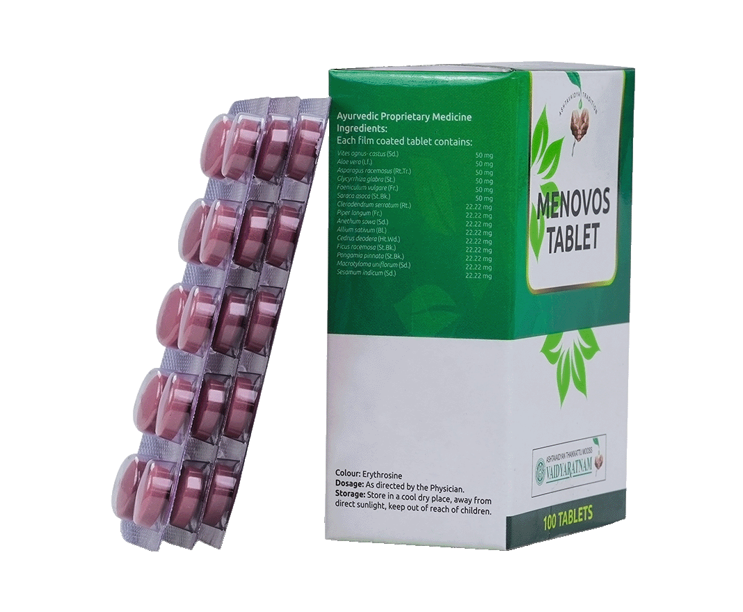 Menovos Tablets are an Ayurvedic formulation designed to support menstrual health and regulate the menstrual cycle. Ideal for addressing issues like anovulation, PCOS, and maintaining uterine health, these tablets offer a natural approach to women's wellness. Why Choose Menovos Tablets?Menovos Tablets are made with a unique blend of Ayurvedic ingredients known for their ability to promote hormonal balance and support regular menstruation. Ideal for those experiencing irregular cycles, menstrual discomfort, or hormonal imbalances like PCOS, these tablets provide a holistic solution to restoring menstrual health. They also act as a uterine tonic, supporting overall reproductive wellness. Key Benefits: Supports Menstrual Health: Regulates the menstrual cycle and promotes balanced hormones. Helps Manage PCOS: Assists in managing the symptoms of PCOS by balancing hormones. Uterine Tonic: Strengthens the uterus and promotes overall reproductive health. Natural & Safe: A trusted Ayurvedic remedy with no harmful chemicals. Improves Ovulation: Helps in improving the chances of regular ovulation. Disclaimer:The products available on this e-commerce website are intended for use under the guidance of a qualified healthcare professional and are not designed to treat any medical conditions. If you have a pre-existing medical condition or are taking other medications, please consult a certified Ayurvedic practitioner or healthcare provider before using our products. The information provided on this site is for educational purposes only and is not intended as a substitute for professional medical advice, diagnosis, or treatment.