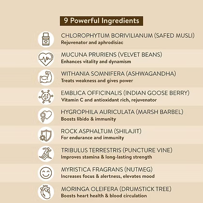 MusliZen Herbal Capsule is an effective natural blend of nine pure herbs that are HPLC-tested, ensuring consistent quality in every capsule and offering ultra-vitality for men to give their best performance. It is designed to improve stamina, strength, vigour, and vitality, provided by the goodness of age-old ayurvedic herbs combined with a hi-tech extraction process to give 100% purity.Key Ingredients:Chlorophytum borivilianum (Safed Musli), Mucuna pruriens (Velvet Bean), Moringa oleifera (Drumstick Tree), Withania somnifera (Ashwagandha), Emblica officinalis (Indian Gooseberry), Tribulus terrestris (Puncture Vine), Hygrophila auriculata (Marsh Barbel), Myristica fragrans (Nutmeg), and Rock asphaltum (Shilajit)Indications:Loss of stamina, vitality and energyProduct Form: CapsuleNet Quantity: 10 capsulesSuitable For: Male/FemaleKey Benefits: Combining various herbs, these capsules promote overall vitality and vigour Helps in balancing energy levels throughout the day, reducing fatigue Adaptogenic properties aid in managing stress and promoting a sense of calmness Supports physical endurance and stamina during daily activities Some constituents assist in enhancing libido and reproductive health Rich in antioxidants, it aids in combating free radicals and supports cellular health Helps fortify the immune system and protects the body from various illnesses and infectionsDirections For Use:Use as directed by the physician.Safety Information: Store in a cool and dry place away from direct sunlight Read the product label carefully before use Keep out of reach of children Do not exceed the recommended dosage