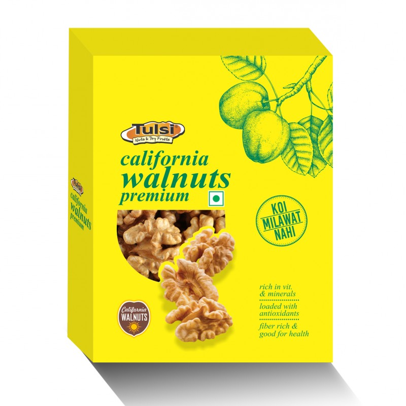 Tulsi California Walnut Kernels Premium is the crunchy and nutty taste of walnuts can accentuate the taste of any delicacy and amps up the health quotient. And an excellent source of several vitamins and minerals. Walnuts are most often eaten on their own as a snack. However, they can also be added to salads, pasta, breakfast cereals, soups, and baked goods. Walnuts are rich in protein. This vitamin may strengthen the immune system and support nerve health. A vitamin B6 deficiency may cause anemia. Keeping walnuts in their shells in a cool, dark, and dry place can improve their shelf life. Walnuts can be a healthful addition to the diet, they can also be added to salads, pasta, breakfast cereals, soups, and baked goods.Tulsi is a premium flavored nuts and dry fruits brand. Tulsi has pioneered a new and yummy way to consume the daily dose of healthy nuts and dry fruits. At Tulsi, we bring the taste and health together in a single pack in the finest of packing. We believe in serving the best products to our customers and hence we travel across the world to procure the finest nuts and dry fruits. Our products are processed and packed in FSSC: 22000 & HACCP certified plant – The best among food safety ratings and certified by ‘FSSAI‘.